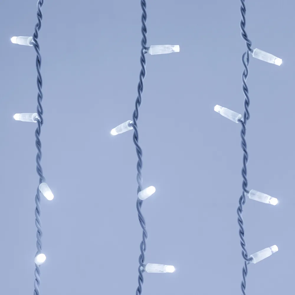Светодиодный Занавес Pro. Размер 2000x3000 мм (длина 2000 мм, высота 3000 мм). 20 ниспадающих нитей длиной 3000 мм. 760 светодиодов размером 7 мм. Цвет свечения БЕЛЫЙ (6000 К), постоянное свечение и 8 динамических эффектов с резким световым рисунком (прозрачная вогнутая линза). Провод белый, каучук. Питание 230 В, Мощность 70 Вт, защита IP65, применение в помещении и на улице под навесом. Аксессуар для подключения и выбора режима свечения в комплекте.