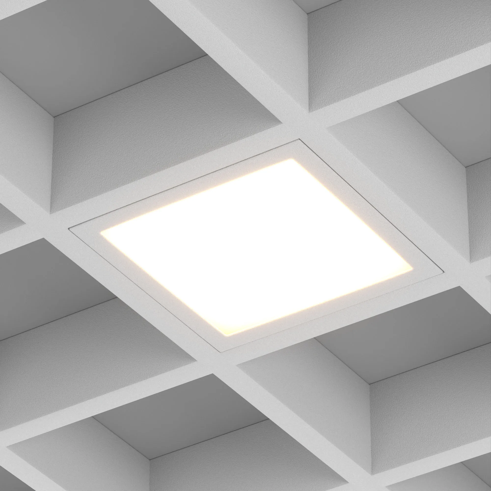 Встраиваемый светильник даунлайт для установки в потолки Грильято с размером ячейки 150х150 мм и высотой направляющих 30, 40 или 50 мм. Мощность 18 Вт, св. поток 1664 лм, 94 лм/Вт, дневной 4000 K, CRI>90, угол 100°, напряжение питания 230 В. Серый квадратный корпус из алюминия (RAL 7045), степень защиты IP40. Размер: длина 140 мм, ширина 140 мм, высота 40 мм. Монтаж встраиваемый, установочное отверстие: длина 140 мм, ширина 140 мм. Драйвер 24-42 В, 450 мА, пульсация <1%.