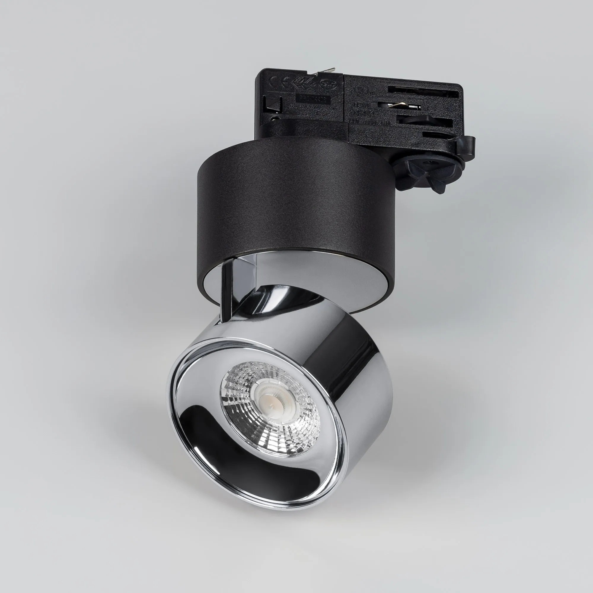 Светильник для треков/шин 4 провода. Мощность 9 Вт, св. поток 500 лм, 55 лм/Вт, теплый 3000 K, CRI>90, угол 36°, напряжение питания 230 В. Модуль цвета хром, черный круглый корпус из алюминия, степень защиты IP20. Размеры корпуса: длина адаптера 86 мм, ширина 32 мм, высота 38,2 мм., высота основания 46 мм. Размер светодиодного модуля: диаметр 77 мм, высота 59 мм. Монтаж на трек 3-фазный. Драйвер 38 В, 200 мА, пульсация <1%.