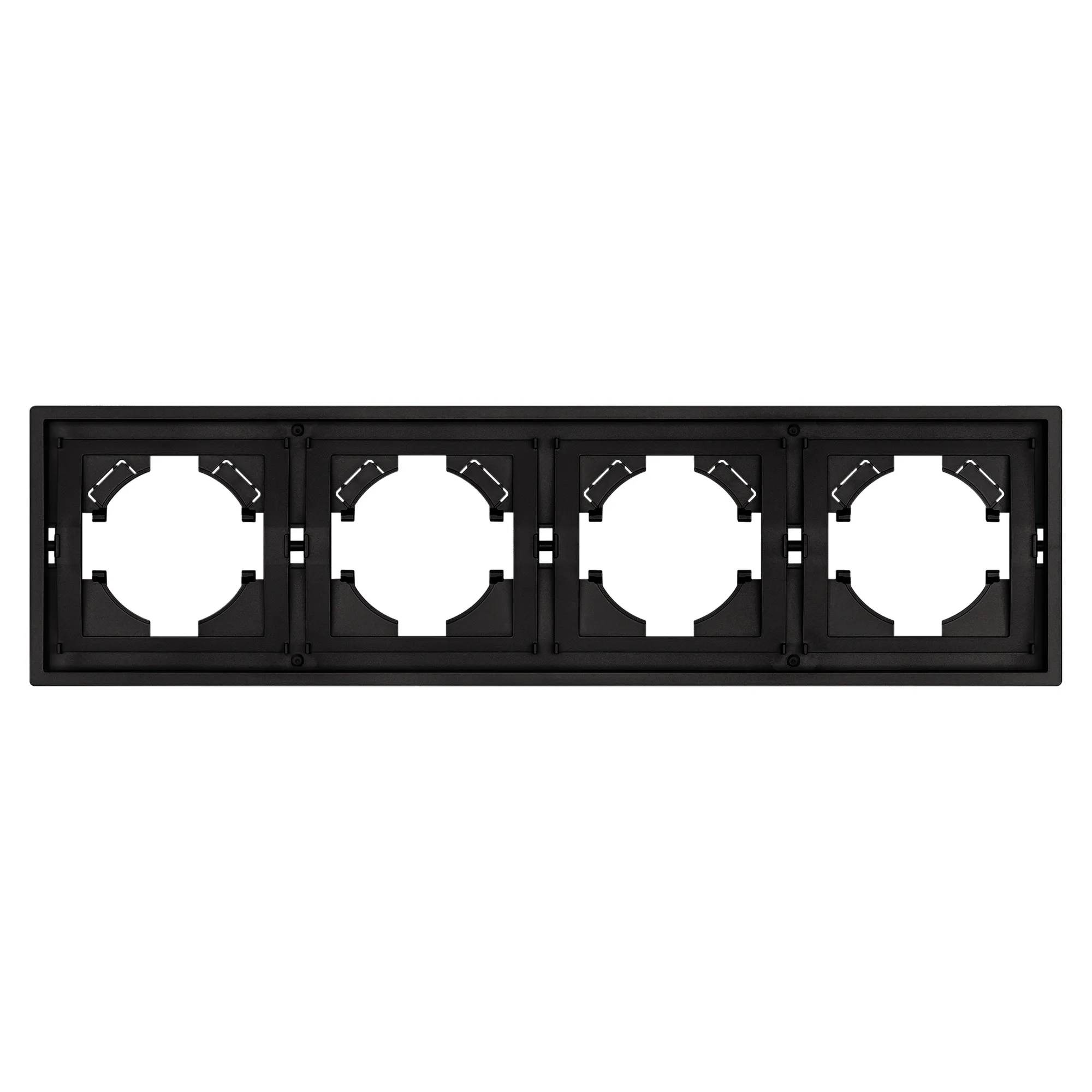 Рамка пластиковая на 4 поста, под встраиваемый механизм. Цвет - матовый черный, с Soft-Touch покрытием. Уровень герметичности IP20. Ориентация монтажа горизонтальная.